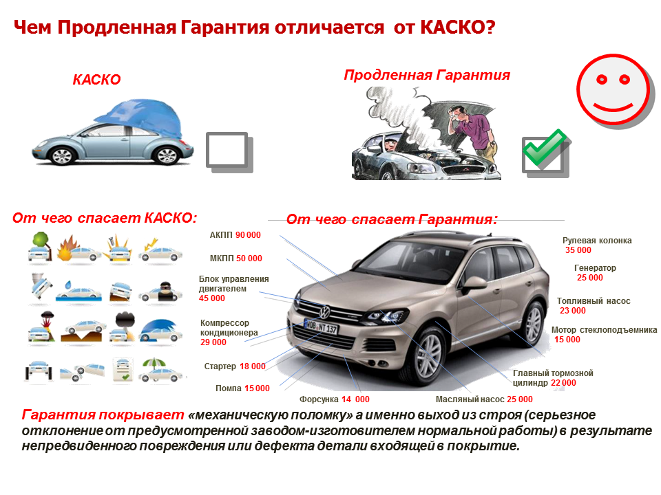 Так, если вы предпочтете наименьший по стоимости базовый тариф, продленная гарантия на автомобиль затронет только двигатель и коробку передач. В расширенном варианте к этому списку добавятся ходовая часть и рулевое управление, система кондиционирования, электрооборудование.
